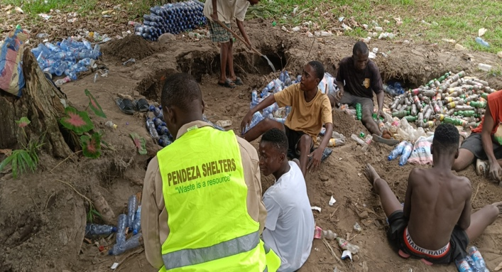 Compaction: Transforming plastic bottles into eco-bricks.